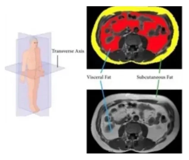 Visceral fat resides deep inside of your abdomen and appears white in the MRI image on the bottom and painted red in the top image. Subcutaneous fat is colored yellow in the cross-sectional view on top. How much visceral fat you have is most accurately established by safe MRI without radiation but can also be seen in an abdominal CT. (See last image below especially if you have ever had an Abdominal CT to find out how much visceral fat you have at least when the scan was done - so keep reading - I cover a few scans showing just how much disease in the body correlates to visceral fat that most people have NO idea about.)
